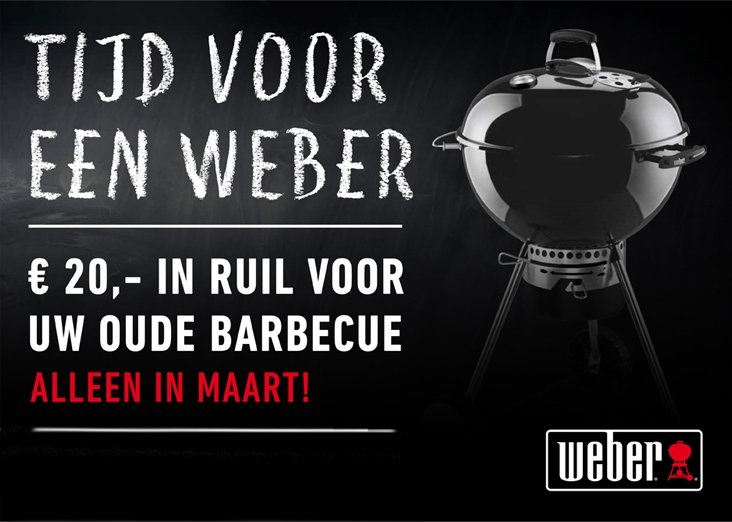 Ben je toe aan een nieuwe Weber? In de maand maart krijg je maar liefst € 20,- korting in ruil voor je oude barbecue. Wat dien je daar voor te doen? Breng je oude barbecue mee naar onze winkel. Dit kan ieder willekeurig merk zijn. Wij ontvangen je oude barbecue. Je krijgt maar liefst € 20,- korting bij aankoop van een nieuwe Weber barbecue.