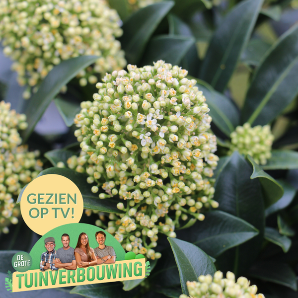 De Skimmia is een groenblijvende, redelijk winterharde tuinplant die vanaf eind augustus begint haar knopzetting aan te maken. Dit zorgt ervoor dat wij het hele najaar kunnen genieten van de kleurrijke knoppen van de Skimmia. Vanaf maart tot april gaan de knoppen bloeien, hier verschijnen er kleine, witte, geurende bloemetjes.