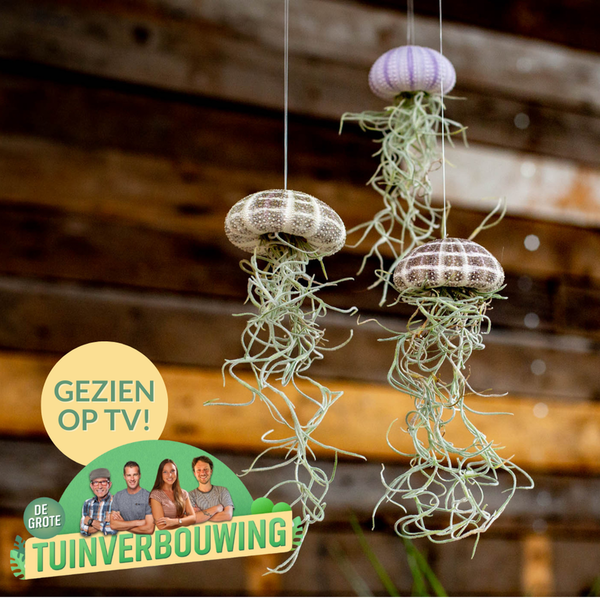Deze Tillandsia is een combinatie van een zee-egel schelp en een airplant. Het is een heel bijzonder aanzicht en daarom ook een echte eyecatcher in ieder interieur.